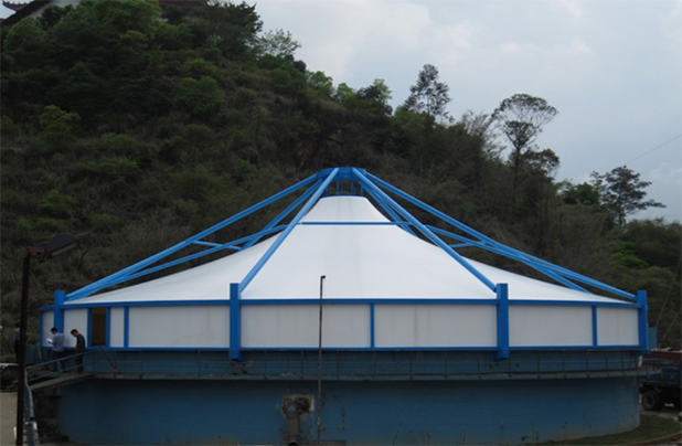 (1)自重輕 氟碳纖膜自重一般只有1kg/m2左右,屬于輕質高強的材料,對于大跨度的池體如沉淀池等尤為適合,從最大程度上減小了覆蓋材自重荷載的影響。另外陽光板和玻璃鋼板需要大量的檁條支承,而膜是通過預力張拉體現結構行為的材料,因此可以做到較大跨度而中間不需要任何支撐桿件,這樣鋼構件的自重也大為減小。