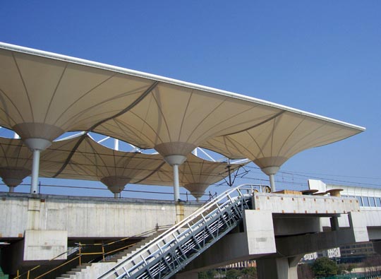 膜結構也稱織物結構,它以性能優良的柔軟織物為材料,由內部空氣壓力支承膜面,或利用柔性鋼索和剛性支承結構使膜面產生一定的預力,從而形成具有一定剛度并能覆蓋大空間的新型空間結構體系。
