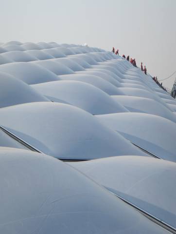 不僅如此,這種膜還具有良好的聲學性能,可有效消除回聲避免了玻璃層頂產生的噪音;具有的自清潔功能,使灰塵不易附在其表面。這種材料另外的一大優點就是可在現場預制成薄膜氣泡,方便施工和維修;近年來,由ETFE 制成的膜材料替代傳統的玻璃和其它高分子采光板用于大型建筑物的屋面或墻體,顯示出無可比擬的優勢。