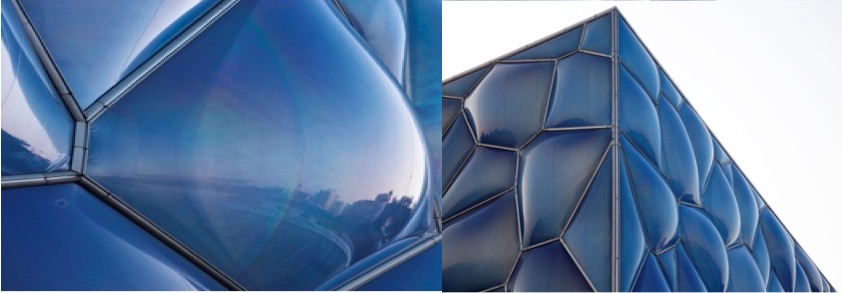 ETFE 膜為現代建筑幕墻和屋頂提供了一個嶄新的面材。由這種膜材制成的屋面和墻體,質量輕,只有同等大小的玻璃質量的1%;韌性好、抗拉強度高、不易被撕裂,延展性大于400%;耐候性和耐化學腐蝕性強,熔融溫度高達200℃,并且不會自燃,可以加工成任何尺寸和形狀,可滿足大跨度要求,節省了中間支撐結構,可以設計出簡潔高雅的結構;