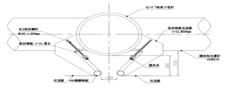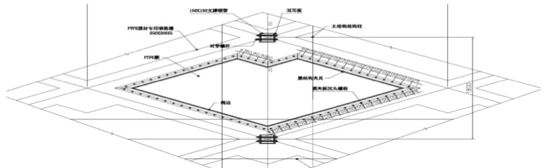 雖然預張力對骨架式膜結構的形態的影響不及張拉膜,但也必須引入足夠大的張力,保證結構受力特性,避免在風荷載作用下膜面發生較大震動,導致松弛膜面凹陷。骨架一般暴露于膜內側,而且膜的透光性更加突顯骨架的室內視覺效果,因此,骨架的布置、形式、材料、節點等是設計考慮的重點,要力求簡潔、美觀。